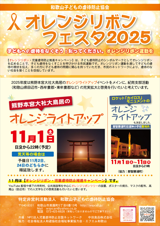 オレンジライトアップされます。ぜひ見に行って下さい。 【熊野本宮大社】 実施日時:令和7年11月1日(土)日没から22時まで ★和歌山市の取組み 11月は「秋のこどもまんなか月間」の取組として 「オレンジリボン・児童虐待防止推進キャンペーン」を実施します。 毎年11月は、「秋のこどもまんなか月間」の取組の一つとし「オレンジリボン・児童虐待防止推進キャンペーン」を実施し、家庭や学校、地域等の社会全般にわたり、児童虐待問題に対する深い関心と理解を得ることができるよう、児童虐待防止のための広報・啓発活動を集中的に行います。和歌山市は、和歌山城ホールと市堀川中橋を児童虐待推進のシンボルカラーであるオレンジにライトアップし、この取組を応援します。 【和歌山城ホール】 実施日時:令和7年11月1日(土)〜10日(月) 日没から22時まで 【市堀川中橋】 実施日時:令和7年11月1日(土)〜7日(金)、26日(水)〜30日(日) 両期間とも17時から23時まで ★和歌山県の取組み 【和歌山ビッグホエール】 実施日時:令和7年11月14日(金)〜16日(日) 18時から21時 ★紀の川市の取組み(予定) 【清州の里 道の駅】 実施日時:令和7年11月10日(月)〜21日(金) 18時から20時 ★那智勝浦町の取組み 【旧浦神小学校敷地内のロケット「カイロス」モニュメント】 実施日時:令和7年11月1(土)〜11日(火) 日没から21時 ○11月15日(土)人権フェスタ2025 ガーデンホテルハナヨ(田辺市) ○年会費のお知らせ(自動引き落としの手続き済みの方) 自動引き落としを4月20日にさせていただきますので残高確認をお願いします。 |